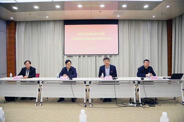 2025年11月29日,扬州工业职业技术学院中层干部专题培训班在江苏师范大学泉山校区正式开班。来自扬州工业职业技术学院的46名中层副职干部参加此次培训。扬州工业职业技术学院党委副书记、校长薛冰,江苏师范大学党委副书记蔡国春出席开班仪式,仪式由江苏师范大学继续教育学院院长朱景坤主持。