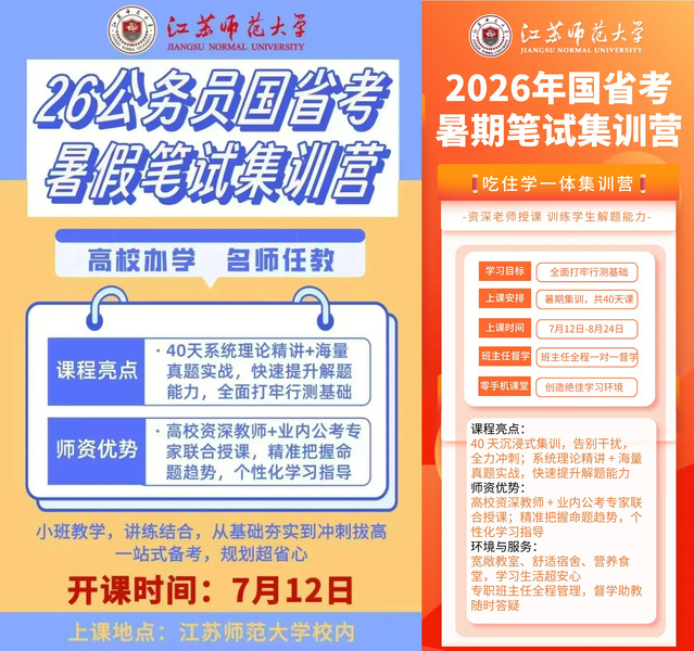 暑期,是公考人弯道超车的黄金期,也是与对手拉开差距的关键战场!但闷热的天气、无处安放的学习计划、自制力不足的困扰,是否让你在备考路上举步维艰?别让大好时光白白溜走!江苏师范大学公考笔试暑期集训营重磅来袭,40 天吃住学一体的沉浸式备考模式,助你攻克备考难题,全力冲刺公职梦想!