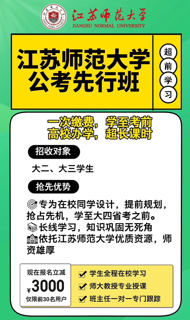 同学们是不是还在还在纠结公考什么时候开始准备?大二大三的同学看过来!江苏师范大学公考先行班,专为咱在校同学设计,带你提前规划,抢占上岸先机!为啥要提前备考?看完这篇你就懂!