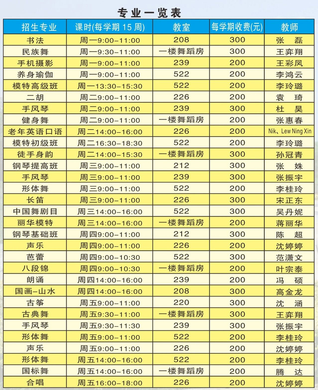 本学期学校开设了书法、国画、声乐、舞蹈、手机摄影、八段锦、老年英语口语、朗诵、中国舞剧目等课程,具体课程时间、地点及授课教师安排见图片《专业一览表》。学员可根据自身兴趣和报名情况前往相应教室上课。