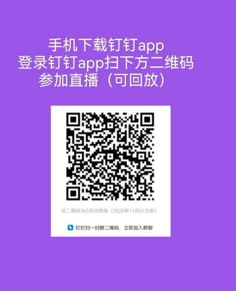 2.线上直播:不能到现场听讲座,可在线听直播或看直播回放。手机下载钉钉APP,登录钉钉APP扫码下方直播二维码进群看直播(可回放)